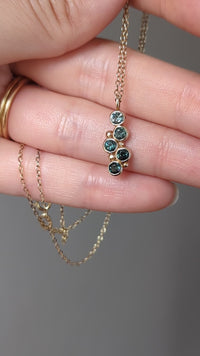 This stunning necklace features 5 natural Australian sapphires in graduating shades of green, bezel set from light to dark in 9ct gold, complemented with solid gold granules.  The stones range from a seafoam green to a dark emerald green.